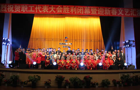 為了慶祝公司第一屆一次職工代表大會順利閉幕,活躍公司廣大職工的文化生活,讓員工提前度過一個歡樂、祥和的春節(jié),在公司黨支部和工會委員會的精心策劃下,在基層分會全體員工的的共同努力下,加班加點排練節(jié)目,為了使每個動作表演到位有效果,演出精彩上檔次,職工對節(jié)目一遍又一邊遍的進行排練、修正,并籌集了演出的服裝、道具,以最高的表演水平充分展示金維公司員工的良好精神面貌。2013年1月19日下午16時,由公司黨支部和工會委員會聯(lián)合舉辦的慶祝公司第一屆一次職工代表大會順利閉幕暨“迎新春”文藝節(jié)目匯演大型晚會,在一片歡慶祥和的新春祝語聲中拉開了帷幕,公司總經(jīng)理陳德剛、副總理高勇、副總經(jīng)理魏偉、財務總監(jiān)高廣禮、生產(chǎn)總監(jiān)王智和公司工會主席劉海玉等領導和公司全體員工觀看了文藝節(jié)目演出活動。